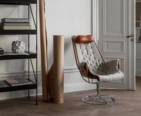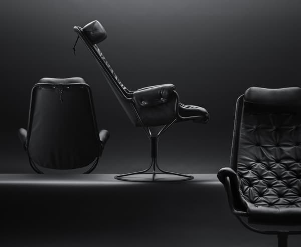 Jetson is an icon of Swedish furniture design. Bruno Mathsson spent three years working on this futuristic armchair, which takes its name from an American TV series. The result was unveiled at an exhibition at Nordiska Galleriet in Stockholm in 1969, and it was a resounding success. Jetson is a milestone in Bruno Mathsson’s production program, and it has had many imitators. A bowl-shaped seat and a high, ergonomically-designed back with a headrest. A base with a unique memory function, so that the chair rotates back to its original position.