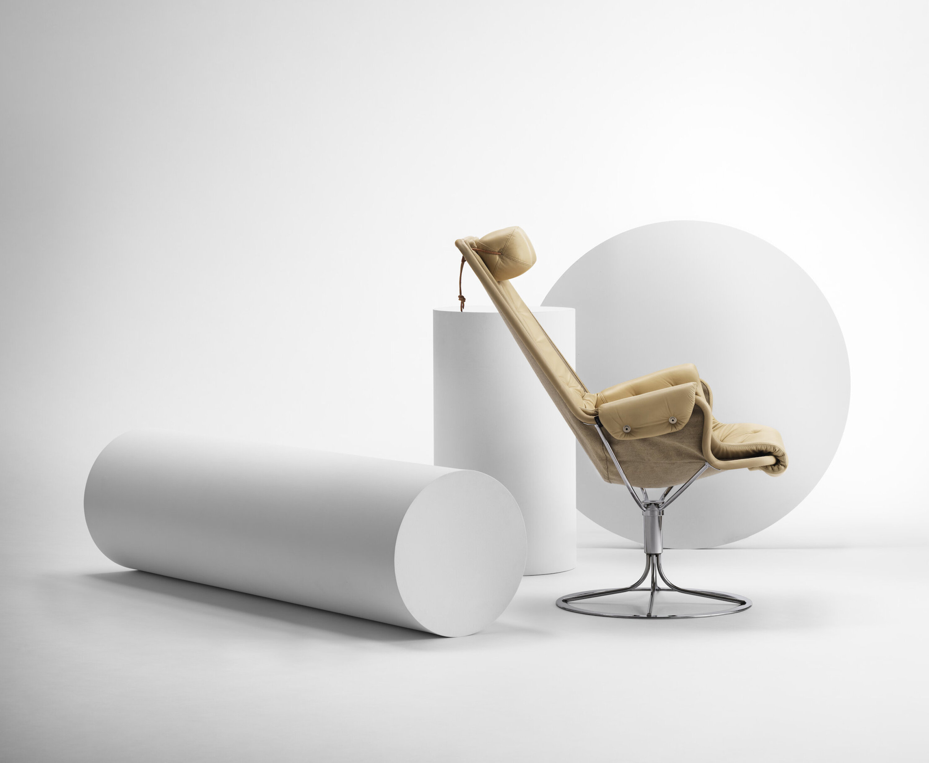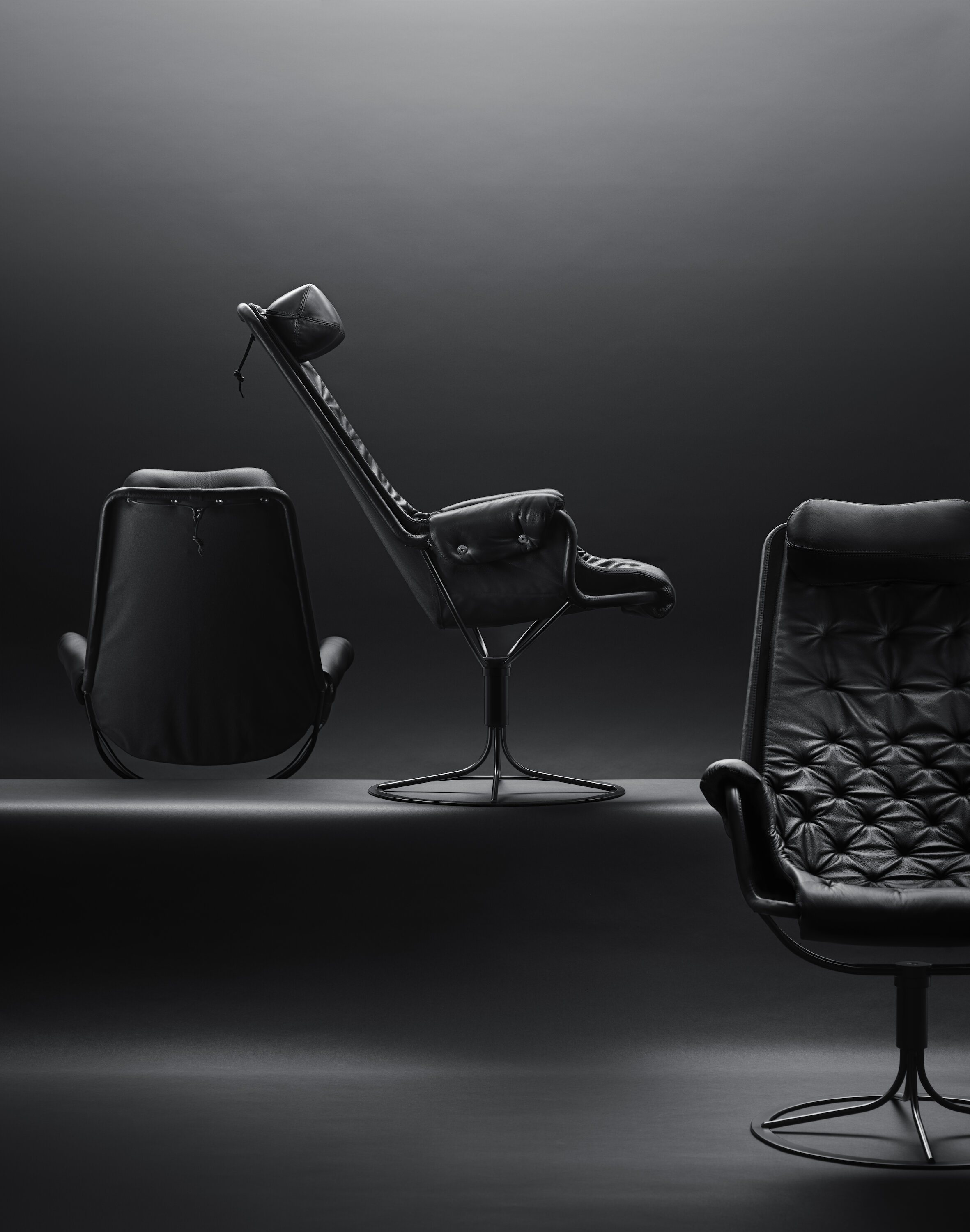 Jetson is an icon of Swedish furniture design. Bruno Mathsson spent three years working on this futuristic armchair, which takes its name from an American TV series. The result was unveiled at an exhibition at Nordiska Galleriet in Stockholm in 1969, and it was a resounding success. Jetson is a milestone in Bruno Mathsson’s production program, and it has had many imitators. A bowl-shaped seat and a high, ergonomically-designed back with a headrest. A base with a unique memory function, so that the chair rotates back to its original position.